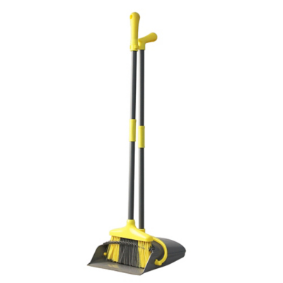 Upright standing lobby broom and dust pan brush w handle.
