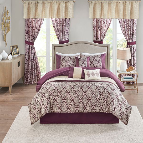 Madison park essentials brystol 24 piece room in a bag faux silk comforter jacquard paisley design matching curtains down alternative hypoallergenic all season bedding set queen blue.